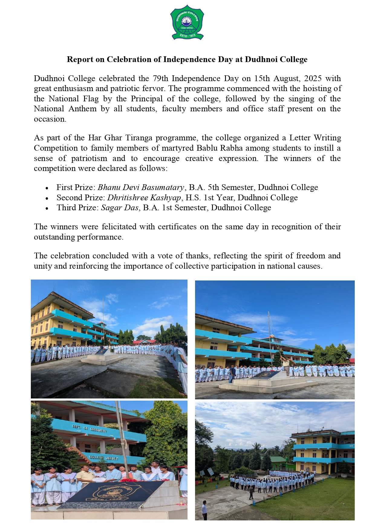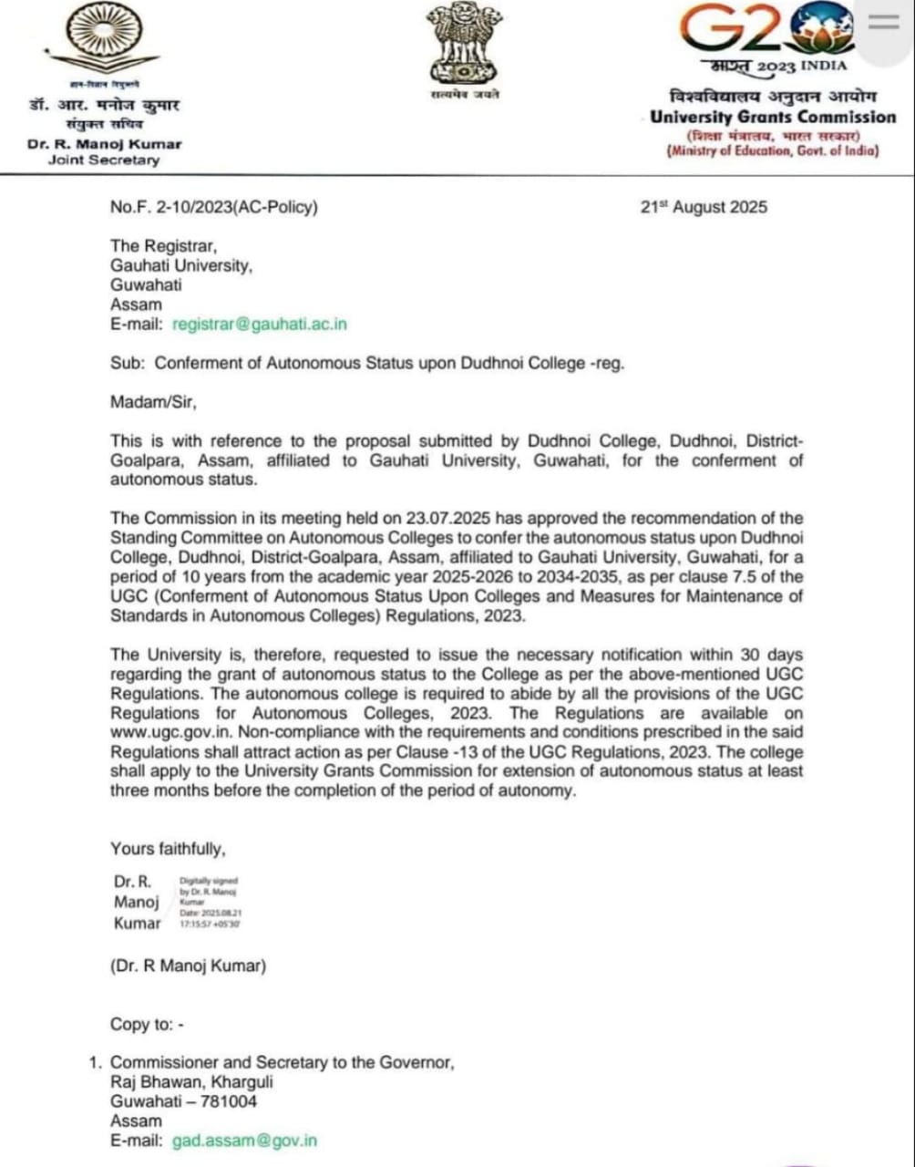 - Dudhnoi College has been granted autonomous status by UGC on 21st August, 2025. View