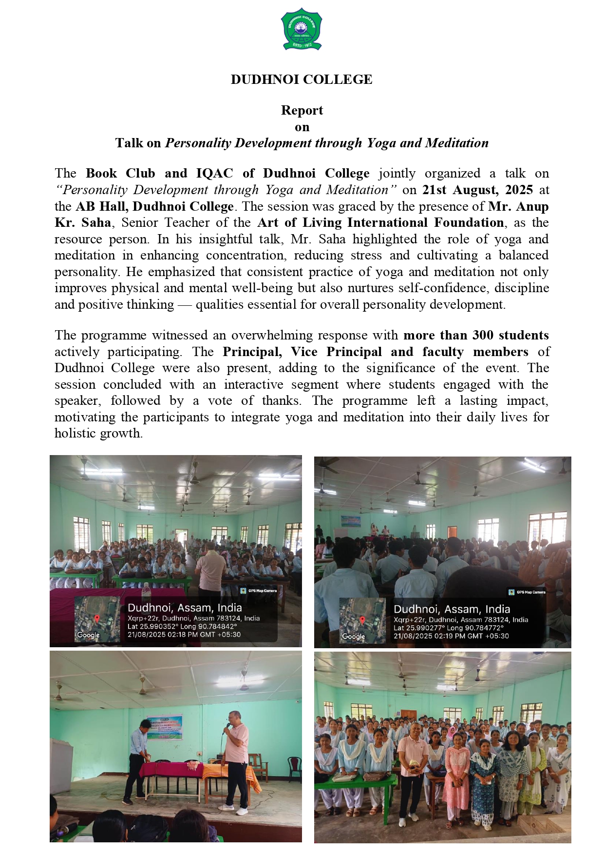 - Talk on 'Personality Development through Yoga and Meditation' at Dudhnoi College on 21st August, 2025. View