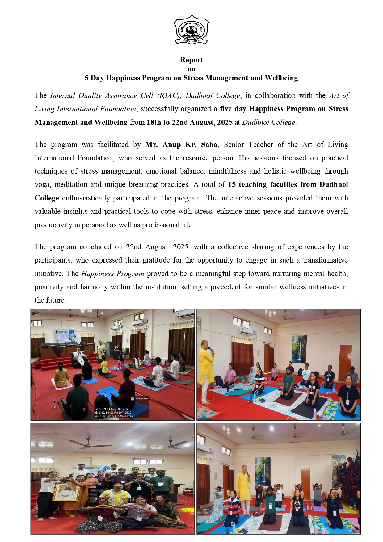 - Completion of 5 Day Happiness Program on Stress Management and Wellbeing at Dudhnoi College View