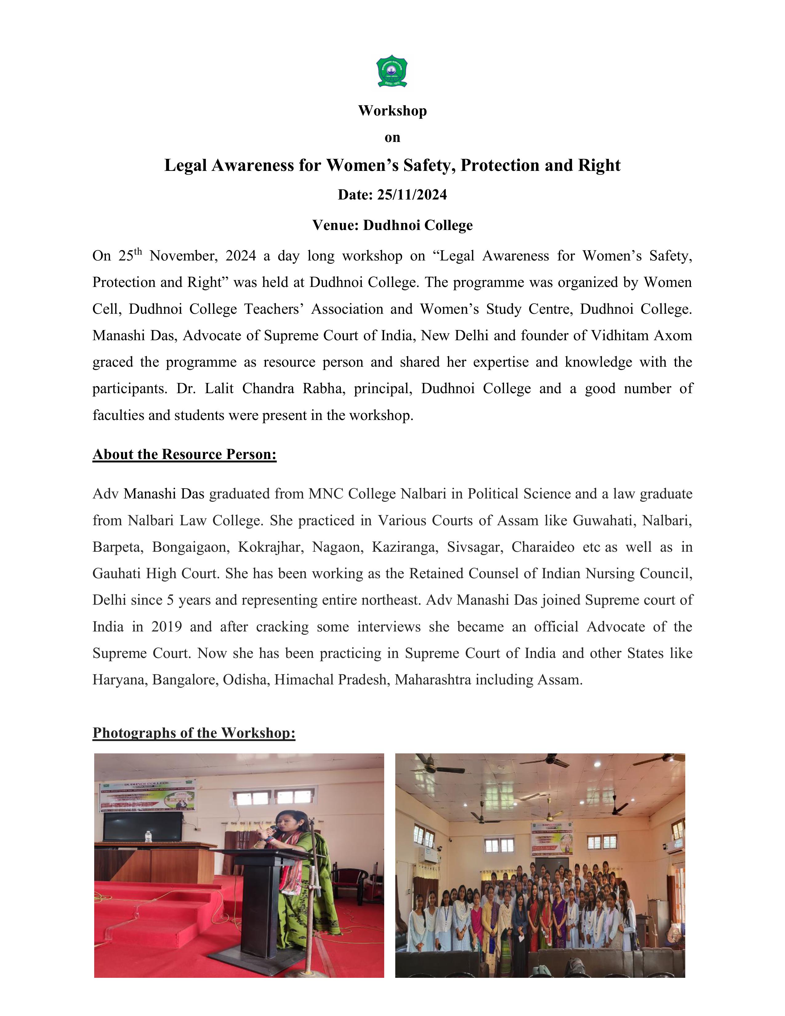 Workshop on "Legal Awareness for Women’s Safety, Protection and Right" on 25th Nov, 2024